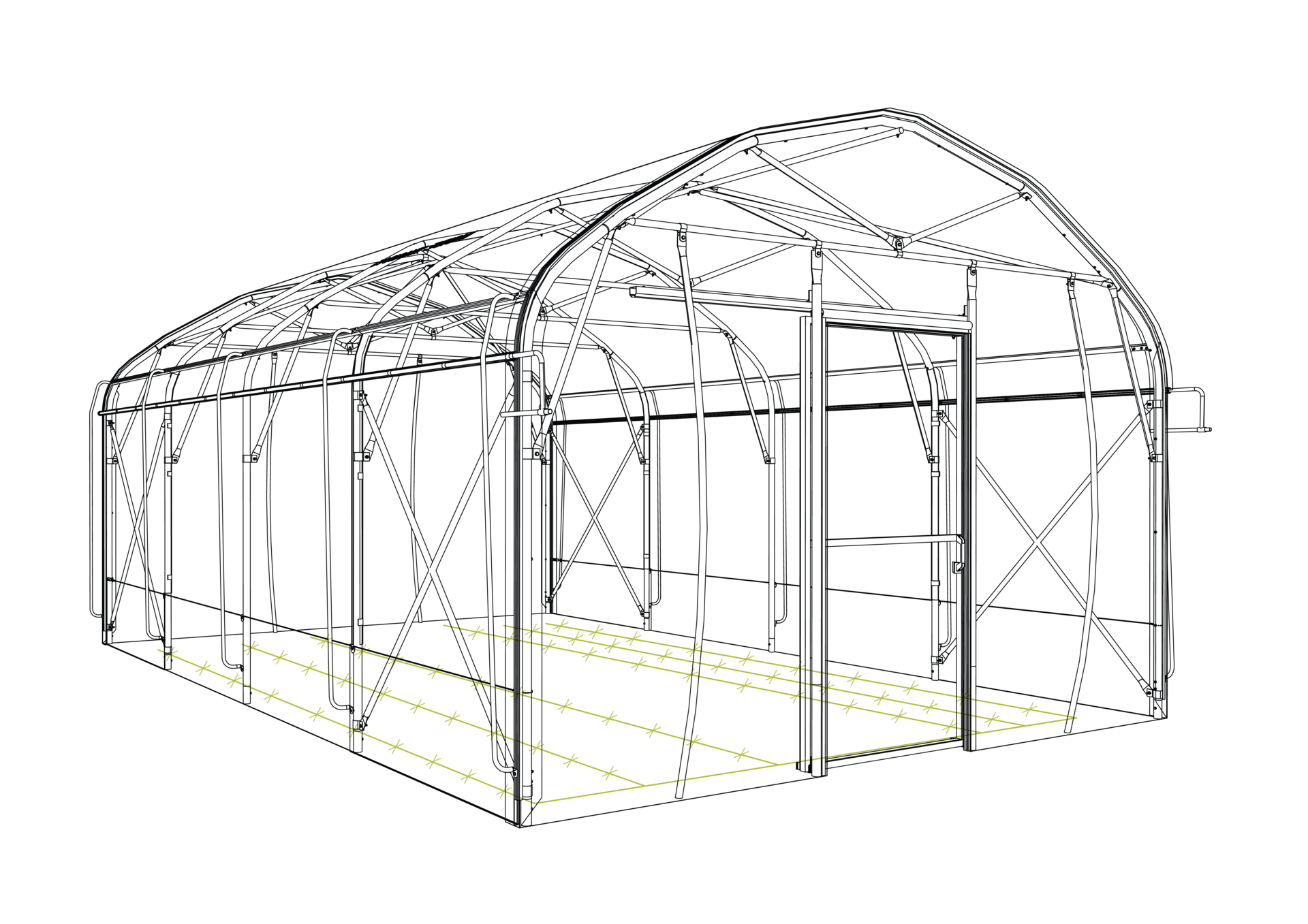 Za učinkovito prezračevanje in enostaven dostop skrbijo polikarbonatna drsna vrata dimenzije 1×2 m, kot tudi bočno prezračevanje na obeh straneh (prvo in zadnje polje je fiksno). Dodatno stabilnost zagotavlja sidranje s sidrnimi cevmi na vseh lokih in vratih, ki se v tla sidrajo do globine 80 cm, kar rastlinjaku daje trdno oporo in dolgo življenjsko dobo.